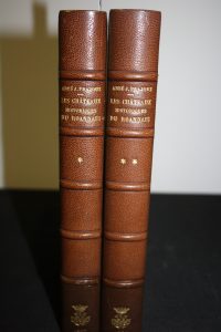 Prajoux (abbé) : Les Châteaux historiques du Roannais. Roanne, Imp.Typo. Souchier, 1927-1930 ; 2 tomes in-8 ; demi-chagrin brun, chiffre doré en queue, tête dorée, couverture et dos conservés (rel. postérieure) ; 8 eaux-fortes H-T par Melle J....