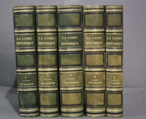 Touchard-Lafosse : Loire (La) historique, pittoresque et biographique. Nantes, Suireau puis Tours, Pornin, 1840-1844 ; 4 tomes en 5 volumes in-8 ; demi-chagrin, veau vert ; 62 gravures sur acier, 300 têtes de pages gravées sur bois, dessins in...