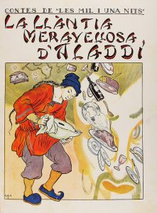 1926. (ILUSTRACIONES-LOLA ANGLADA-INFANTIL). LA LLANTIA MERAVELLOSA D´ALADDI. Mataró: H. Abadal, 1926. Folio. Ilustraciones a color de Lola Anglada. Folio. Rústica ilustrada. Sutiles y diminutas manchas de óxido en la cubierta y en la última hoja.