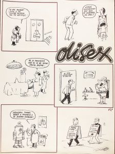1985 ca. (COMIC). OLI: CONJUNTO DE 20 HOJAS CON ORIGINALES DE LA SECCION OLISEX, PUBLICADA EN LA REVISTA PAPUS. Tinta sobre papel montados en cartoné de 44x33 cm. Varias viñetas en cada hoja.