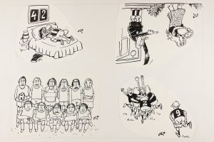 1985 ca. (EROTICA-COMIC). CONJUNTO DE 10 HOJAS CON ORIGINALES EROTICO-SATIRICOS DE LA SECCION OLISEX PUBLICADA EN LA REVISTA PAPUS. Tinta sobre cartoné de 44x28 cm. reciclado. 4 viñetas en cada hoja. Se adjuntan 2 hojas con collage de viñetas...