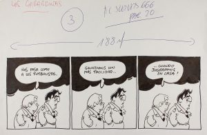 1985 ca. (COMIC). OLI: CONJUNTO DE 11 HOJAS CON ORIGINALES DE LOS PERSONAJES LOS GABARDINAS, PUBLICADOS EN EL JUEVES. Tinta sobre papel en folio apaisado. 3 o 4 viñetas por hoja.