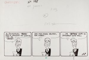 1985 ca. (COMIC). OLI: CONJUNTO DE 7 HOJAS CON ORIGINALES DEL PERSONAJE CARRASCAL, PUBLICADOS EN EL JUEVES. Tinta sobre papel en folio apaisado. Tres viñetas en cada hoja.