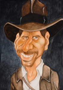 2005 ca. (ILUSTRACIONES-COMIC). LLUVIA NABAU, JORDI: ORIGINAL RETRATO COMICO DE HARRISON FORD HACIENDO DE INDIANA JONES. Aguada sobre cartoné. 42x30 cm.