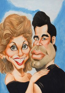 2005 ca. (ILUSTRACIONES-SATIRICO). LLUVA NABAU, JORDI: RETRATO COMICO DE OLIVIA NEWTON-JOHN Y JOHN TRAVOLTA. Lápiz, color y aguada sobre crtoné de 42x30 cm.