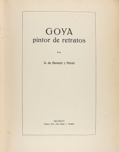 1916. (ARTE-GOYA). BERUETE Y MORET, A. DE: GOYA PINTOR DE: RETRATOS -COMPOSICIONES Y FIGURAS- GRABADOR. Madrid: Blass y. Cía., 1916. 3 volúmenes. 4º mayor. 1: VIII + 184 p., 1 hoja,. 55 láminas. 2: VIII + 176 p., 1 hoja, 62 láminas. 3: IX +...