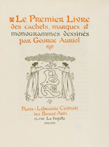 1901. (BIBLIOFILIA). AURIOL, GEORGES: LE PREMIER LIVRE DES CACHETS, MARQUES ET MONOGRAMMES. Paris: Libr. Centrale des Beaux-Arts, 1901. 8º. 6 h. + 71 fol., 1 h. Rústica. Papel de hilo. Es la historia del diseño gráfico, su legado es una...