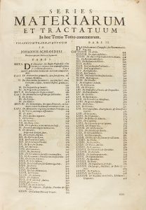 1720 ca. (CIENCIAS). [MULLERI, MICHAELIS:]. [COLLEGIUM PHARMACEUTICUM IN JOHANNIS SCHROEDERI]. Falto de la portada. Folio. 606 p., 37 h. de índices. Texto a dos columnas. Señal marginal de polilla en algunas hojas.