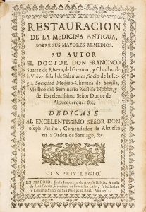 1731. (MEDICINA). SUAREZ DE RIVERA, FRANCISCO: RESTAURACION DE LA MEDICINA ANTIGUA. Madrid: en la imprenta de Alonso Balás, 1731. 8º mayor. 42 p. + 368 p. 8 p. Portada orlada con grabado, frontis con escudo a plena página, 3 láminas y...