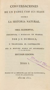 1811-1813. (CIENCIAS NATURALES). DUBROCA, J.F.: CONVERSACIONES DE UN PADRE CON SUS HIJOS SOBRE LA HISTORIA NATURAL. Madrid: Imp. que fue de Fuentenebro, 1811-1813. 4 vols. en 8º. I: XV + 197 p., 6 h., 1 lám.; II: 248 p., 13 h., 2 láms.; III: 302...