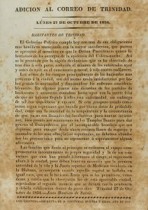 1834. (CUBA-MEDICINA). ANUNCIO A LOS HABITANTES DE LA VILLA DE TRINIDAD CON INSTRUCCIONES PRECISAS DE COMO DEBEN COMBATIRSE LAS EPIDEMIAS DE COLERA MORBO QUE ASOLA LA ISLA. Imp. de Cristobal Murtra e hijos, 1834. 20x28 cm.