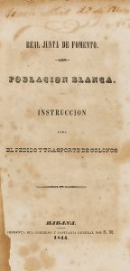 1844. (CUBA). REAL JUNTA DE FOMENTO. POBLACION BLANCA. INSTRUCCION PARA EL PEDIDO Y TRASPORTE DE COLONOS. Habana: Imp. del Gobierno y Capitania General, 1844. 17 p. Papel muy tostado. Rústica.