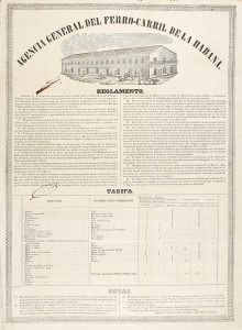 1847. (CUBA-FERROCARRIL). AGENCIA GENERAL DEL FERRO-CARRIL DE LA HABANA. Cartel con el reglamento y las tarifas. Grabado en la parte superior y orla. 45,5x33 cm.