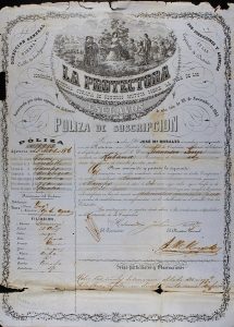 1857. (CUBA-ESCLAVITUD). POLIZA DE ESCLAVOS DE LA COMPAÑIA LA PROTECTORA. 37x27 cm, ilustrada con un grabado central. Firmada en la Habana, 30 de Julio de 1857.