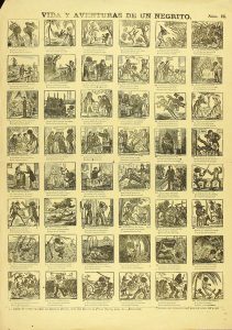 1868. (ESCLAVITUD-AUCA). VIDA Y AVENTURAS DE UN NEGRITO. Barcelona: Suc. de Antonio Bosch, 1868. 44,5 x 33,5 cm. Narra la historia de un joven africano que es capturado como esclavo, sus aventuras y su trágico final. Doblez central, Rara.