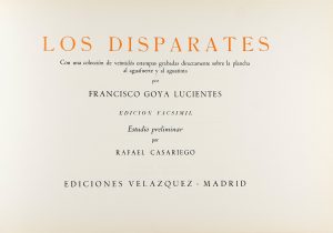 1974. (FACSIMIL). GOYA Y LUCIENTES, FRANCISCO DE: LOS DISPARATES. Con una colección del veintidós estampas grabadas directamente sobre la plancha al aguafuerte y al aguatinta. Estudio preliminar por Rafael Casariego. Madrid: Eds. Velazquez, 1974....