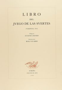 1991. (FACSIMIL). LIBRO DEL JUEGO DE LAS SUERTES (VALENCIA 1515). Salamanca: Ed. Europa, Ediciones de Arte, 1991. Folio mayor. 10 p. de comentarios y aprox. 50 hojas de facsímil de la obra, en grueso papel de hilo. Ejemplar en rama presentado en...