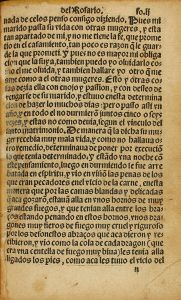 quarenta Milagros hechos / por virtud del santo Rosario, agora / nuevamente añadidos por el / mesmo auctor. (al folio CLXXIXV): Fin de la segunda parte de los Mi/lagros agora nuevamente aña / didos. Barcelona: sa. 8º menor. Tipos góticos de dos tamaños, texto a línea tirada. Letras capitales xilográficas. Empieza en el folio LI (sign. n), termina en el folio CLXXIX. = 128 folios. Signaturas n-z8, &8, A-D8. Encuadernación moderna (c. 1950) en medio pergamino. Unico ejemplar de una edición desconocida pero probablemente de las impresas en Barcelona o México después de 1552. Se conoce un fragmento impreso en [Valencia] 1554, de parecidas características pero signaturas diferentes. También una edición de México, Pedro Balli, 1576, impresa en tipos romanos, pero entre estas dos se suponen otras que bien pueden estar impresas en otros puntos: Tortosa, Valencia, o México. Los ejemplares conservados son siempre fragmentarios, y no llegan a dos o tres ediciones las que han llegado hasta nosotros de esta traducción castellana. El estilo de los relatos milgrosos entre de lleno en la novela popular de carcater amoroso, ya que casi todos ellos son protagonizados por mujeres y lances de amor. El autor publicó en lengua catalana por vez primera este texto en Barcelona 1556, y le siguieron innumerables ediciones en los tres siglos siguientes. Muchos de los milagros descritos ocurren a personas de lugares de Cataluña (Lérida, Balaguer, Puigcerdá, etc). Termina la obra en el folio CLXXIX, que contiene el último capítulo de los milagros, y nos da la fecha más cercana a esta impresión: Capitulo XLII. De una mu/jer librada de un falso testimonio, y de la mu/erte por virtud del santo rosario. En el año de mil quinientos cin/quenta y dos, en la ciudad de Ba/laguer una buena mujer […].