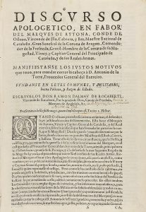 1648. (LERIDA). DALMAU DE ROCABERTI, RAMON [Vizconde de Rocaberti, Conde de Perelada]: DISCURSO APOLOGÉTICO, EN FAVOR DEL MARQUÉS DE AYTONA, CONDE DE OSSONA [...] VIRREY Y CAPITÁN GENERAL DEL PRINCIPADO DE CATALUÑA, Y DE SUS REALES ARMAS....