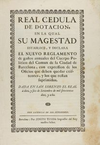 1718. (CATALUNYA). REAL CELULA DE DOTACION EN LA QUAL SU MAGESTAD ESTABLECE, Y DECLARA EL NUEVO REGLAMENTO DE GASTOS ANNUALES DEL CUERPO POLITICO DEL COMUN DE LA CIUDAD DE BARCELONA con expreffion de los Oficios que deben quedar existentes, y los...
