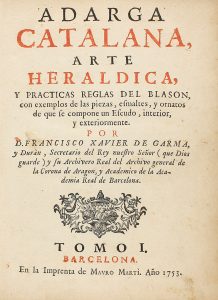 1753. GARMA Y DURAN, FRANCISCO: ADARGA CATALANA. ARTE HERALDICA Y PRACTICAS REGLAS DEL BLASON, con exemplos de las piezas, esmaltes, y ornatos de que se compone un escudo, interior, y exterior. Barcelona: en la imprenta Mauro Marti, 1753. 2 vol. en...