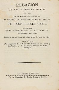 1807 ca. (SANT JOSEP ORIOL). RELACIÓN DE LAS SOLEMNES FIESTAS CON QUE EN LA CIUDAD DE BARCELONA SE CELEBRÓ LA BEATIFICACIÓN DE SU PAISANO EL DOCTOR JOSEF ORIOL, BENEFICIADO DE LA IGLESIA DE NTRA. SRA. DE LOS REYES VULGARMENTE DEL PINO. DESDE EL...
