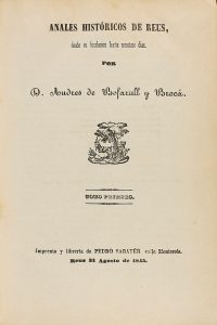 1845. (REUS). BOFARULL Y BROCA, ANDRES DE: ANALES HISTORICOS DE REUS, DESDE SU FUNDACION HASTA NUESTROS DIAS. Reus: Imp. y Libr. Pedro Sabater, 1845. 2 tomos en 1 vol. en 8º mayor. I: 259 p., 2 h.; II: 377 p., 3 h., 1 lám. plegada. Enc. en plena...