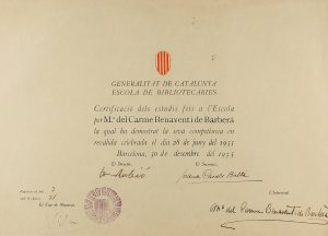 1935. (DIPLOMA). GENERALITAT DE CATALUNYA. ESCOLA DE BIBLIOTECARIES. Diploma de certificación de estudios a favor de Mª del Carmen Benaventi de Barberà. Dado el 30 de diciembre de 1935. Varias viñetas en el dorso y sellos estampillados.