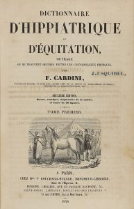 1848. (EQUITACION). CARDINI, F.: DICTIONNAIRE D´HIPPIATRIQUE ET D´EQUITATION, ... Paris: Veuve Bouchard-Huzard, 1848. 2 vols. en 4º mayor. XVI-720-596 pp. Abundantes láminas fueras de texto. Enc. en plena piel. Lomo decorado. Ex-libris.