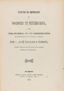 1858. (EQUITACION). HIDALGO Y TERRON, JOSE: TRATADO DE EQUITACION Y NOCIONES DE VETERINARIA O SEA IDEA GENERAL DE LOS CONOCIMIENTOS QUE DEBE REUNIR TODO HOMBRE A CABALLO. Madrid: Imp. Militar de Don Pedro Montero, 1858. 8º. 315 p., 1 h. 3 láminas...