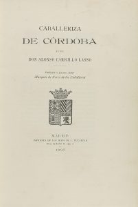 1895. (EQUITACION). CARRILLO LASSO, Alonso: CABALLERIZA DE CORDOBA. Publícala el Excmo. Señor Marqués de Xerez de los Caballeros. Madrid, Imp. J. Ducazcal, 1895. 4º, X+3 h.+46 p. Papel de hilo. Amplios márgenes. Enc. en media piel. Edición...