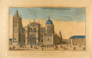 1780 ca. (VISTA OPTICA). PAREJA DE VISTAS OPTICAS: FONTAINE DU SOLEIL A MADRID; EGLISE CATHEDRAL DE TOLEDE. Paris: chez Daumont. 2 grabados al cobre, coloreados. Plancha 27x40,5 cm, papel 30x49 cm. Papel tostado.