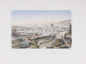 1865. (FLORENCIA). DURUY, A. [Dibujante y litógrafo]: ITALIA. FLORENCIA. VISTA TOMADA DE SAN MINIATO DEL MONTE, PLAZA DE MIGEL ANGELO. Paris: L. Turgis, c. 1865. 55x72 cm. (Hoja). Litografia en colores y retoques a mano. Perfecto estado de...