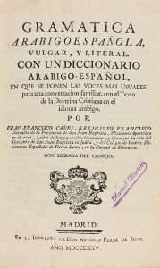 1775. (LINGÜISTICA). CAÑES, FRANCISCO: GRAMATICA ARABIGO-ESPAÑOLA, VULGAR, Y LITERAL CON UN DICCIONARIO ARABIGO-ESPAÑOL. Madrid: Imp. Antonio Perez de Soto, 1775. 9 h. + 272 p. Enc. en plena piel, nervios, cortes pintados. Sellos estampillados...