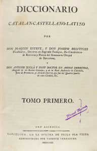 1803. (LINGÜISTICA). ESTEVE, JOAQUIN; BELVITGES, JOSEPH; JUGLA Y FONT, ANTONIO: DICCIONARIO CATALAN-CASTELLANO-LATINO. Barcelona: Oficina de Tecla Pla, 1803. 2 tomos en 1 vol. en folio menor. I: 419 p.; II: 429 p. Texto a dos columnas. Enc. de...
