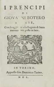 1600. (POLITICA, PRECEPTIVA REAL). BOTERO BENES, JUAN: I PRENCIPI DI GIOVANNI BOTERO BENESE, CON LE AGGIONTE ALLA RAGION DI STATO NUOVAMENTE POSTE IN LUCE. in Torino: Appresso Gio. Dominico Tarino [al fin:] per Pantaleone Gossi & Lorenzo Vallino,...