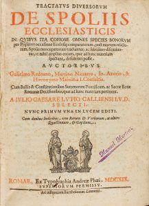 1619. (HISTORIA-RELIGION). REDOANO, GULIELMO; NAVARRO, MARTINO; AZORIO, IO.; MAINATIA, HIERONYMO: TRACTATUS DIVERSORUM DE SPOLIIS ECCLESIASTICIS IN QUIBUS ITA COIOSE OMNES SPECIES BONORUM PER PRELATOS... Romae: ex typ. Andreae Phaei, 1619. 4º...