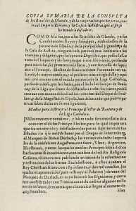 OLANDA, Y A SUS CONFEDERADOS REYES Y PRINCIPES, EMBIDIOSOS DE LA POTENCIA DE ESPAÑA, Y DE LA PROSPERIDAD Y GRANDEZA DE LA CASA DE AUSTRIA, NINGUNA COSA PAREZCA MAS CONTARIA A SUS TRAMPAS Y DESIGNIOS [...]. (AL FIIN:) PERO LOS HOMBRES PONEN, Y DIOS DISPONE. S.l., s.a. Folio menor. 4 p. en un pliego de dos hojas. Texto a linea tirada, 37 lineas. Tipografia gastada. Ejeplar que conserva todo su margen sin cortar. Impreso efímero muy raro. En nota manuscrita de la época al final del impreso en el margen exterior: ´Es copia de lo resuelto en Olanda contra el Imperio y casa de Austria de conjurazion que se supo antes de ejecutarse en el año de 1625´. No en Palau. Un ejemplar en la Nacional de Madrid, ningún otro en bibliotecas públicas.