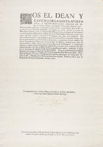 IGLESIA DE SEÑOR SANTIAGO, UNICO Y SINGULAR PATRON DE LAS ESPAÑAS...HAZEMOS SABER A LOS QUE LAS PRESENTES VIEREN, COMO EN ESTA SANTA IGLESIA, ESTÁ VACA UNA DE LAS DOS PLAÇAS DE ORGANISTA (QUE SIEMPRE AY EN ELLA) POR FIN, Y MUERTE DE DON BENITO LARRAZ Y ESTRADA, LA QUAL DICHA PLAÇA, SE SIRVE ALTERNANDO EN LAS SEMANAS, CON EL COMPAÑERO ORGANISTA, ESCEPTO QUE EN LAS FESTIVIDADES SOLEMNES EN QUE CONCURREN LOS DOS, ASSISTEN CADA UNO A SU ORGANO, SIN TENER OTRA RESIDENCIA..., FECHAS EN ELLA A CINCO DE NOVIEMBRE DE MIL Y SEISCIENTOS Y SETENTA Y SIETE. Santiago de Compostela: s.i., 1677. Gran folio. Una hoja de papel verjurado conservando todos sus márgenes. Tipografia a linea tirada, letra capital xilográfica. Firma autógrafa del secretario del cabildo de la catedral. Conserva todos los margenes naturales. Impreso rarísimo de corto tirage. El dean y cabildo de la iglesia de Santiago convocan una plaza por oposición, de organista (de las dos que existen) por muerte de Benito Laraz y Estrada, uno de ellos. Firma autógrafa del secretario del Cabildo. No en Atanasio López, La Imprenta en Galicia.