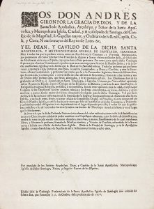 Compostela: 1678. Folio mayor. Tipografia a tres tamaños y letra inicial ´N´ xilográfica. Impreso no citado por el P.Atanasio López, ni tampoco por Palau. Empieza: ´Nos don Andres Girón por la gracia de Dios...Arçobispo de Santiago...hazemos saber a todos los que la presente vieren, como en ella esta vaca la canongia y Prevenda Penitenciaria, por promoción del Señor Doctor Francisco de Aguiar y Seyjas ultimo posseedor de ella, al Obispado de Mechoacan, en la Nueva España...´ Desconocido de las bibliografías consultadas.