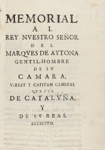 [1648]. 4º menor. 46 folios (numerados por error 44). Cubiertas de papel antiguo. Ejemplar sin cortar, con todas las barbas. Edición original de extrema rareza. Escribe este Memorial al Rey estando en prisión el Marqués de Aytona, a la sazón Virrey de Cataluña, por haber hecho decapitar a a Antonio de la Torre, Proveedor General del Ejercito en Lérida (23. de noviembre de 1647); por haberle faltado a la obediencia a raiz de un suceso con las monjas de San Hilario en Lérida. Palau 175702.