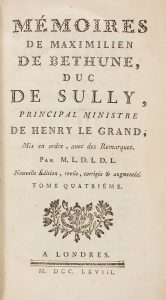 1768. (HISTORIA). MEMOIRES DE MAXIMILIEN DE BETHUNE, DUC DE SULLY, PRINCIPALE MINISTRE DE HENRY LE GRAND. Londes: s.i., 1768. 4 vols. 8º menor. I: LXVI + 392 p.; II: X + 538 p.; III: VIII + 539 p.; IV: X + 437 p. Enc. en plena piel, nervios,...