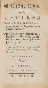 1772. (HISTORIA-PRUSIA). RECUEIL DE LETTRES DE S.M. LE ROI DE PRUSSE POUR SERVIR A L´HISTOIRE DE LA GUERRE DERNIER. Leipsick: aux depans des Libraires associés, 1772. 8º menor. III + 182 p. Enc. en plena piel, nervios y tejuelo, lomo rozado,...