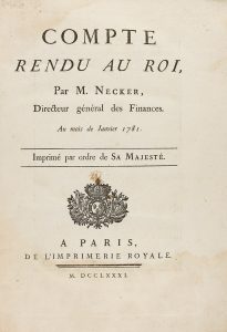 1781. (HISTORIA). NECKER: COMPTE RENDU AU ROI. Paris: Imp. Royale, 1781. 4º. 2 h. + 116 p., 1 estado plegado, 2 mapas coloreados plegados, 1 retrato grabado. Antiguo cerco de humedad. Enc. en plena piel, cortes pintados, faltas en el lomo.