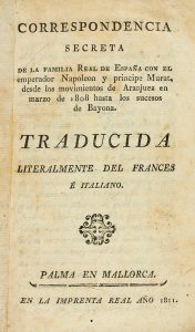de Mallorca: en la Imprenta Real (?), 1811. 8º menor. 3 h. + 58 p. Cubiertas de papel antiguo. Edición original muy rara. Contiene la transcripción de las cartas enviadas por Carlos IV y su esposa Maria Luisa de Parma, a Napoleon I, al gran duque de Berg; de Fernando VII al Emperador, etc.
