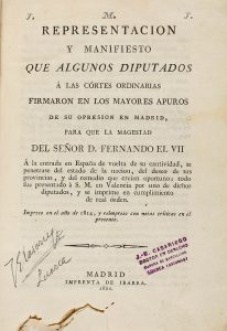 el año 1814 y reimpreso con notas críticas en el presente. 8º mayor. 78 p. [Sigue:] REFUTACION AL MANIFIESTO Y REPRESENTACION QUE ALGUNOS DIPUTADOS A LAS CORTES ORDINARIAS DE 1814 FIRMARON EN MADRID Y PRESENTARON EN VALENCIA A S.M. AL SEÑOR DON FERNANDO EL VII. 82-307 p. Enc. juntos en plena piel. Señal de polilla en las primera y las últimas hojas.