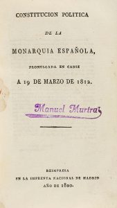 1820. (CONSTITUCION). CONSTITUCION POLITICA DE LA MONARQUIA ESPAÑOLA PROMULGADA EN CADIZ A 19 DE MARZO DE 1812. Madrid: Imp. Nacional, 1820. 12º. 120 p., 1 h. [Sigue:] DISCURSO PRELIMINAR LEIDO EN LAS CORTES AL PRESENTAR LA COMISION DE...
