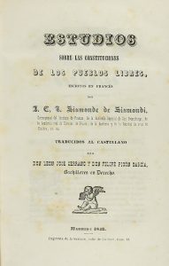 1843. (CONSTITUCIONALISMO). SISMONDE DE SISMONDI, JEAN: ESTUDIOS SOBRE LAS CONSTITUCIONES DE LOS PUEBLOS LIBRES, ESCRITOS EN FRANCÉS ... Y TRADUCIDOS AL CASTELLANO POR D. LEÓN JOSÉ SERRANO Y D. FELIPE PICÓN GARCÍA. Madrid: Imprenta de la...
