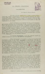Gasset. Reza el primer parágrafo: ´El insigne pensador Rovira i Virgili escribió un lúcido ensayo bajo el título de ´El problema de las Nacionalidades Ibéricas´que contiene una visión exacta, amplia y cordial de la angustiosa cuestión. Desde mi sentimentalidad castellana y a través del aire diáfano de las llanuras por las que cabalgó Don Quijote, me siento absolutamente identificado con los puntos de vista y las conclusiones de este trabajo´. Sello estampillado en la esquina superior izquierda de la primera hoja Ortega y Gasset con su dirección en Venezuela, a la derecha sello estampillado con ilustración de El Quijote.
