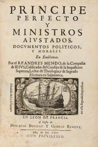 1662. (EDUCACION DE PRINCIPES). MENDO, P. ANDRES: PRINCIPE PERFECTO Y MINISTROS AJUSTADO. Documentos políticos y morales. En emblemas. Leon de Francia, 1662. Leon de Francia: 1662. 4º. Grabados al cobre. Piel de la época con nervios. Bellísimo...